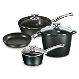 This 7 pc set is perfect for the beginning cook. Made from cast aluminum, it is exceptionally sturdy and yet lightweight. The 3-layer nonstick interior and 2-layer nonstick exterior surface is guaranteed never to chip, crack, blister, bubble or peel and makes it easy to clean the pan while also eliminating the need for excess fats, oils, or cooking sprays. The phenolic handle allows for safe and easy transport without the need for potholders.